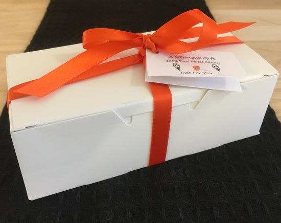 Each gift box contains eighteen 100% pure Vermont maple candies. Each candy weighs approximately 0.5 oz. and is 1-5/8" tall x 1" wide x 1/2" to 5/8" thick. Net Weight: 9 oz. Candies are layered and separated by candy pads and wax-type candy papers for safe delivery.