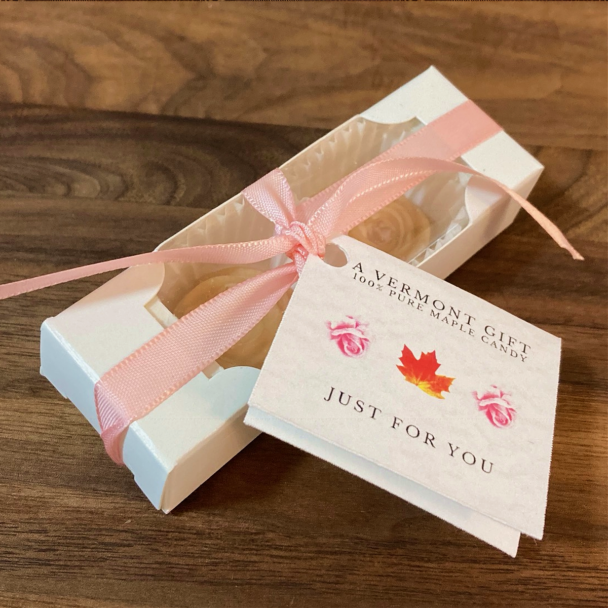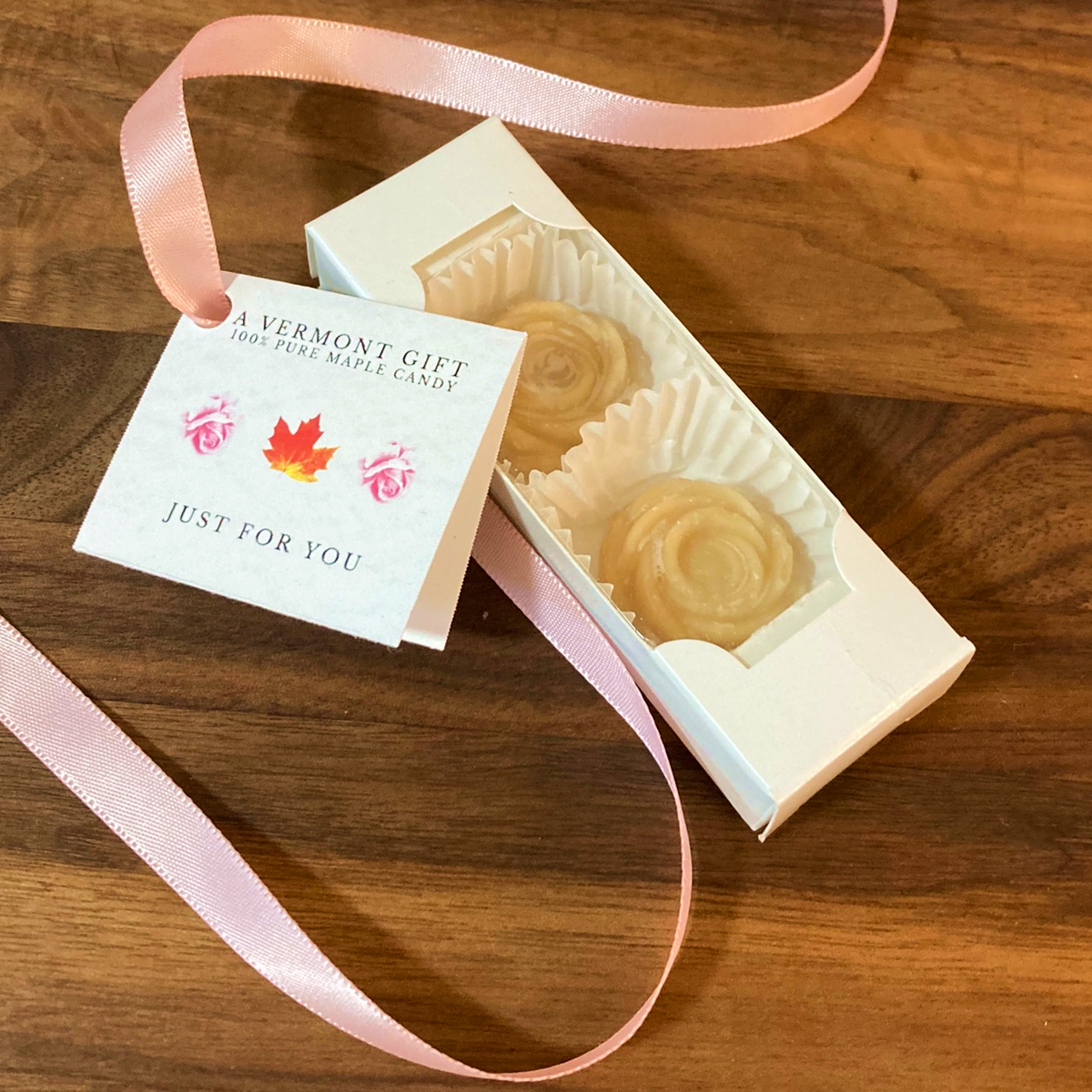 Two 0.26 oz. "bite-sized" rose-shaped maple candies, individually boxed with ribbon and tag. Each candy measures 1-1/8" round x 3/8" thick. Made from 100% pure ORGANIC Vermont maple syrup.