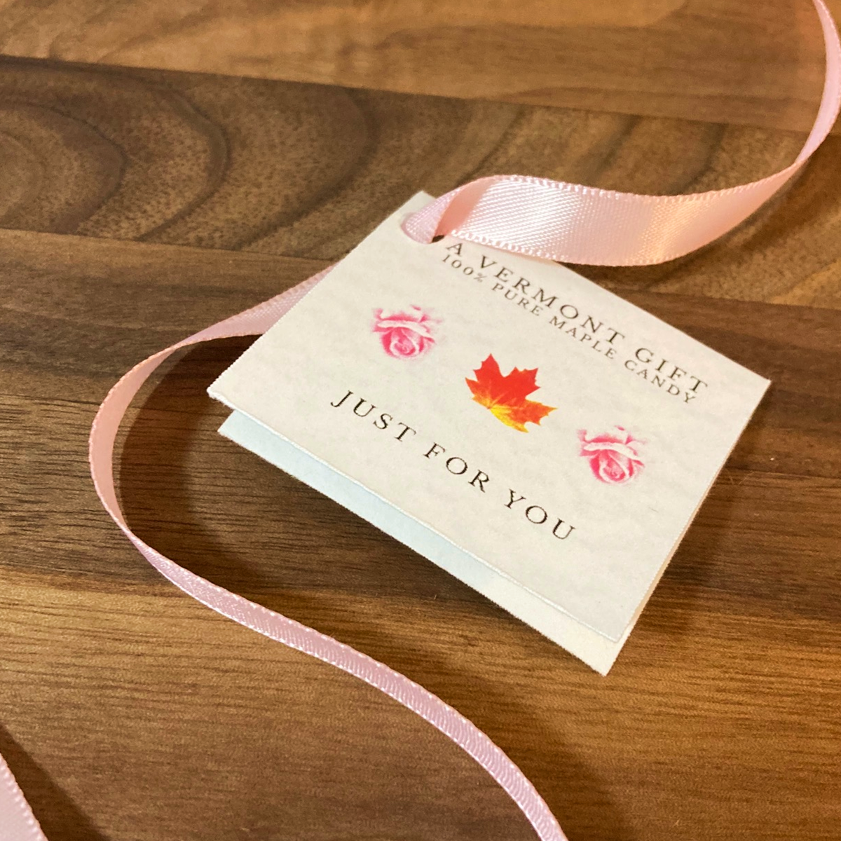 The Custom Tag & Ribbon - Each maple candy wedding favor includes a personalized tag with colorful maple leaf and roses. The outside of the tag is printed with "A Vermont Gift. Just For You." The Bride & Groom's names and wedding date are printed on the inside of the tag.