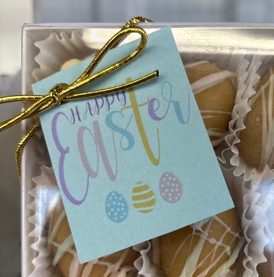 Elastic Band & Gift Tag - This gift box is secured with a gold elastic band and includes a decorative Easter gift tag, on which is printed, "Happy Easter!" on the outside. *Gift tag may vary slightly from current photography.