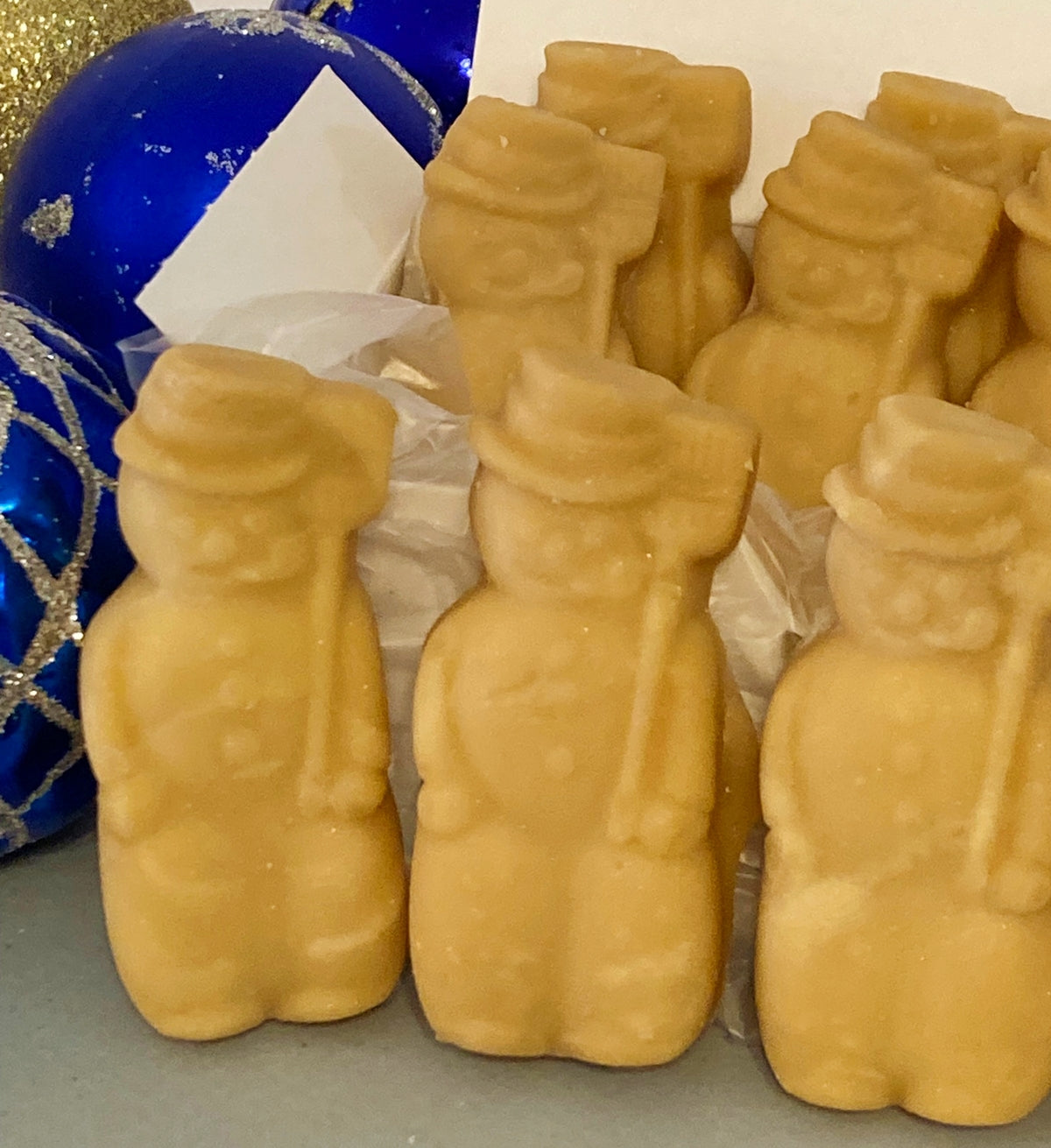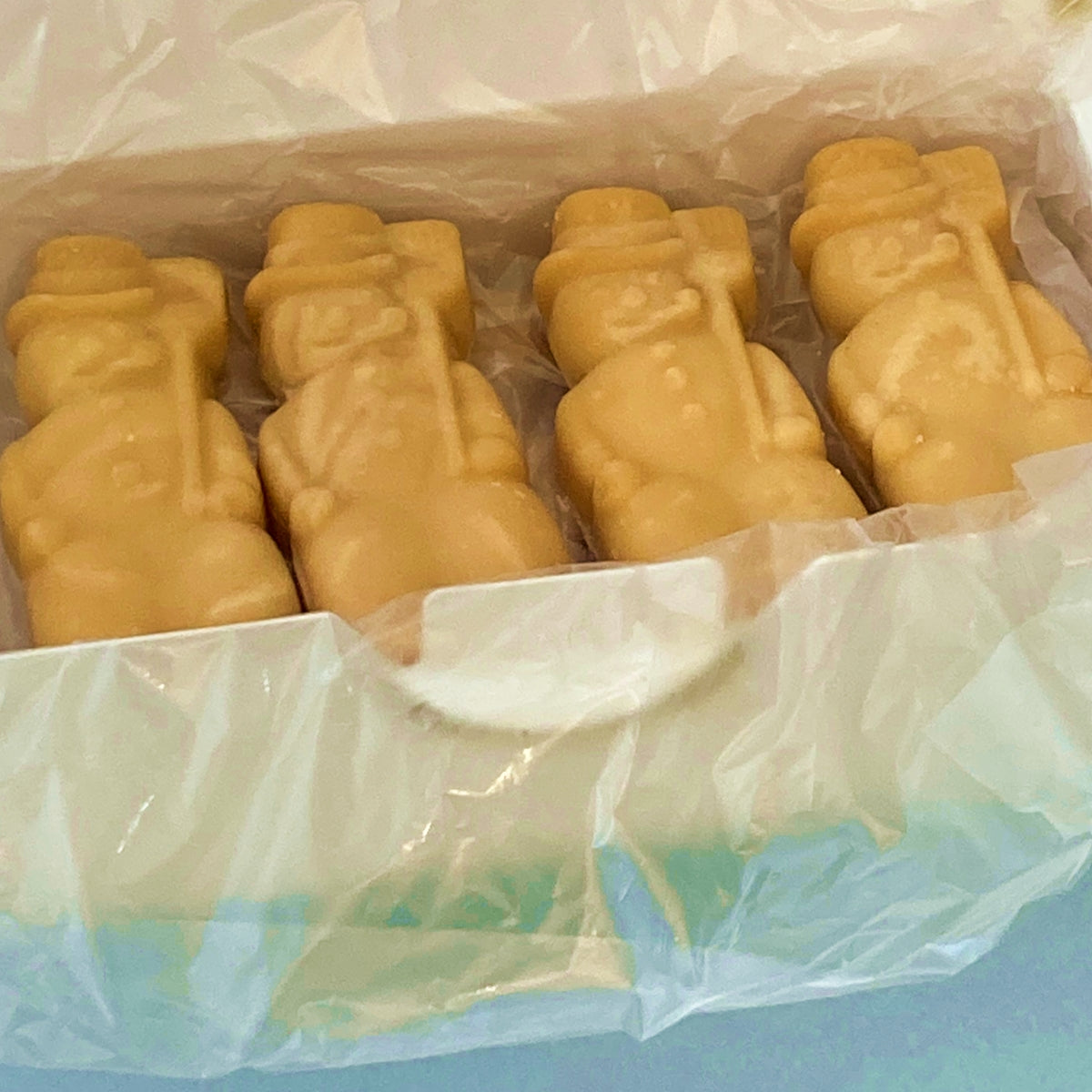 Each maple candy gift box contains 12 snowman-shaped candies. Each candy measures 2-1/2 high x 1-1/8 wide x 1/2 thick, (0.75 oz. each). Candies are layered in box, separated by candy papers and candy pads. Net Weight: 9 oz.