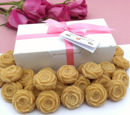 Each maple candy gift box contains 30 rose-shaped candies. Each candy measures 1" round x 1/2" thick, and weighs 0.26 oz. each. Candies are layered and separated by candy pads and wax-type candy papers for safe delivery. Net Weight: 7.8 oz.